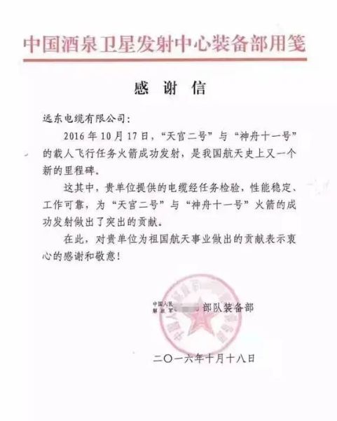 時間拉回七年前,遠東電纜收到過一封來自酒泉衛星發射中心的感謝信,記錄了“緊急時刻”下遠東電纜與中國航天的鏈接。2016年9月16日晚近12時,“神舟十一號”發射工作已經進入調試階段,遠東電纜突然接到來自酒泉衛星發射中心的電話,中心表示希望公司能在三天內,趕制一批航空用高端電纜產品并送至酒泉,助力航天基地建設及“神州十一號”發射。“公司接到任務快速反應,立即停下手頭所有訂單的生產,全力趕工,最終用72小時的“火箭速度”不辱使命交上滿意答卷?!边h東電纜相關負責人表示。