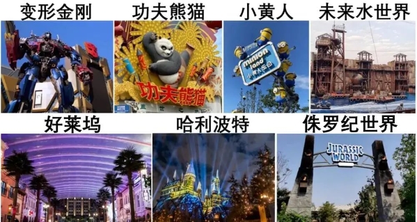 北京環球影城共包含七大主題景區、37處騎乘娛樂設施及地標景點、24場娛樂演出、80家餐飲及30家零售門店。許多承載影迷回憶的經典IP,包括功夫熊貓、變形金剛、小黃人和哈利·波特等將悉數登場。