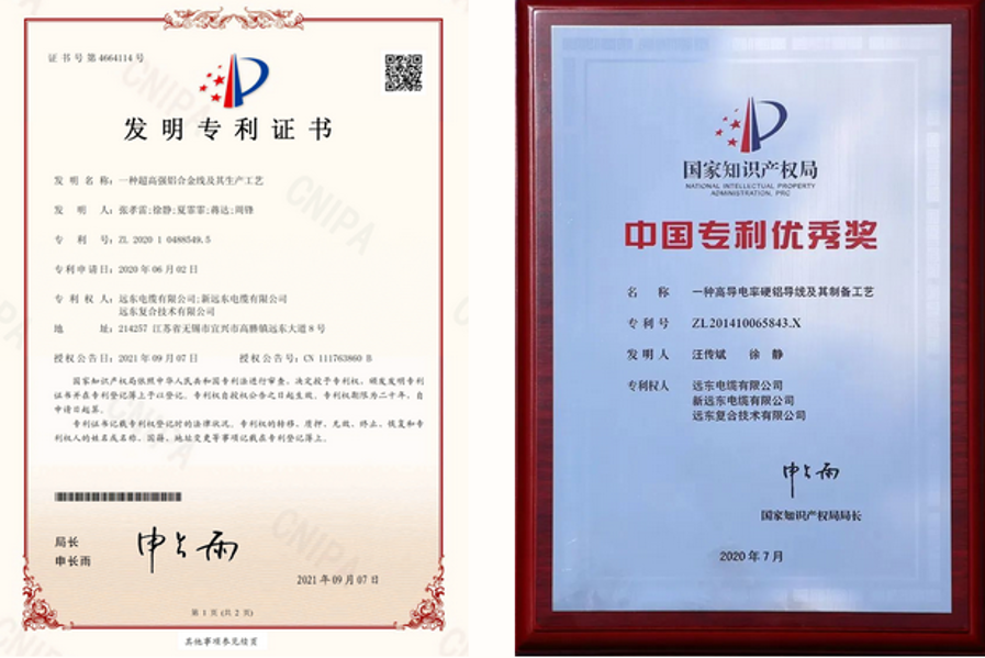 由遠東電纜經過多年技術攻關研發出的特高壓線路用高導鋁及鋁合金系列產品是具有多項發明專利的核心產品,無論是硬鋁導電率還是高強度鋁合金導電率等性能都處在國際領先水平,并榮獲中國專利獎。
